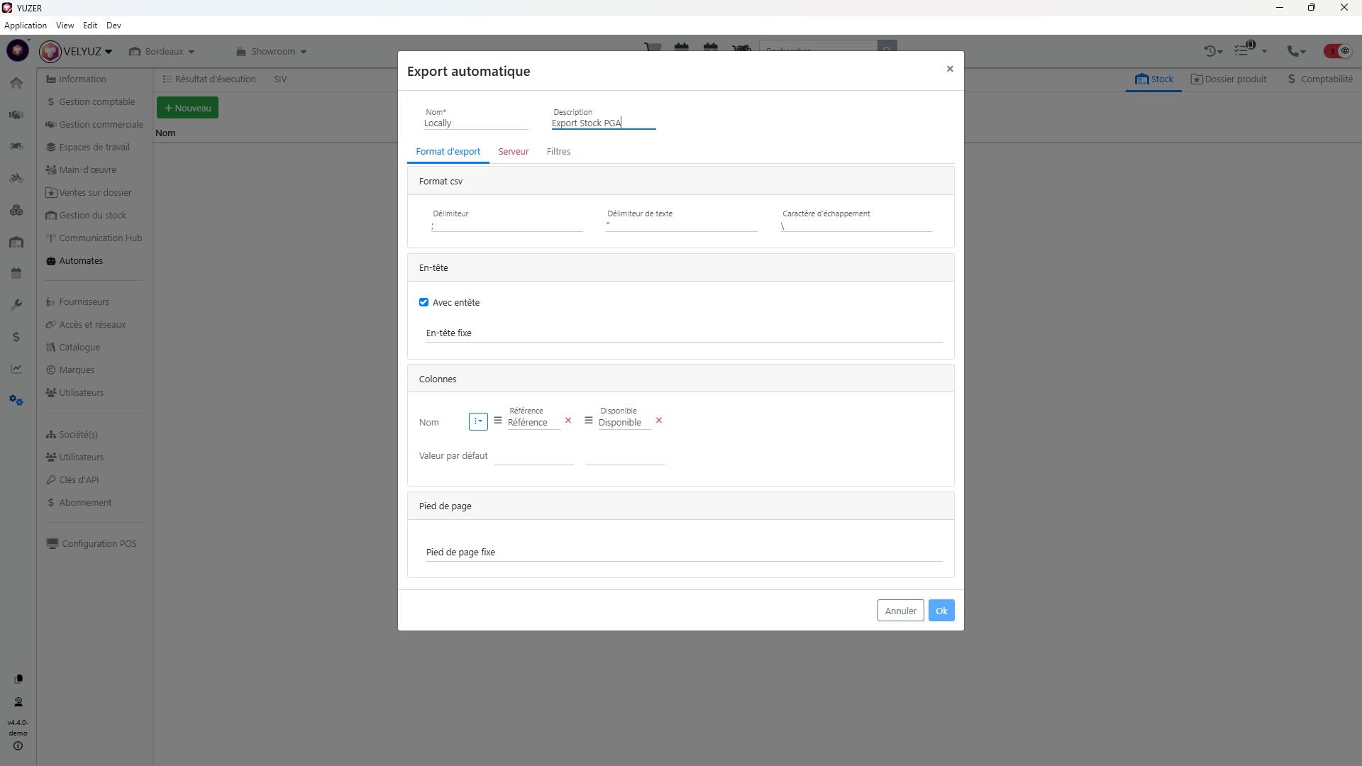 13\. Renseigner un nom pour le fichier exporté avec les champs de date, le nom du point de vente, et l'information [[PGA]] (Parts Accessories Garments : Pièces Accessoires et vêtements).\