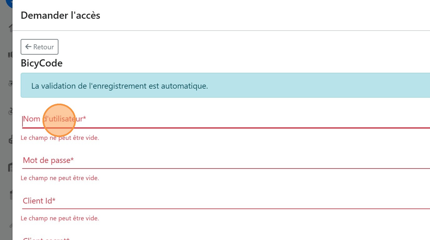 5\. Renseigner le [[Nom d'utilisateur]] fourni par Bicycode