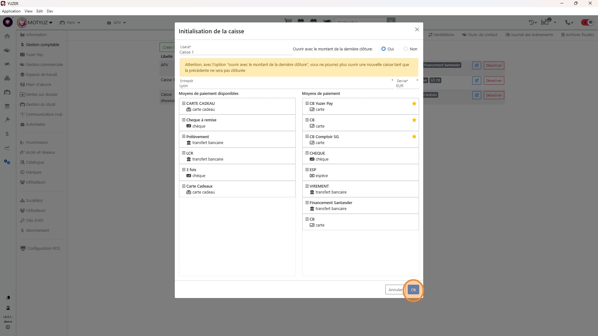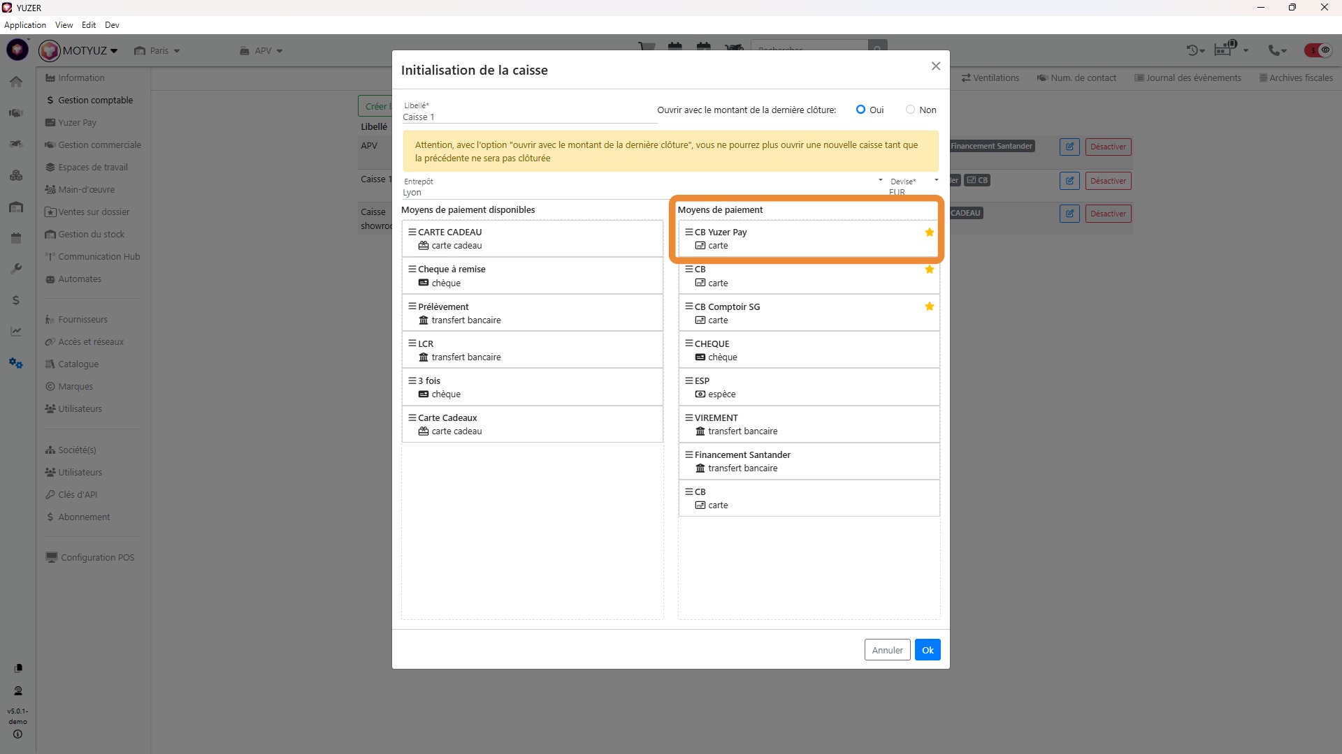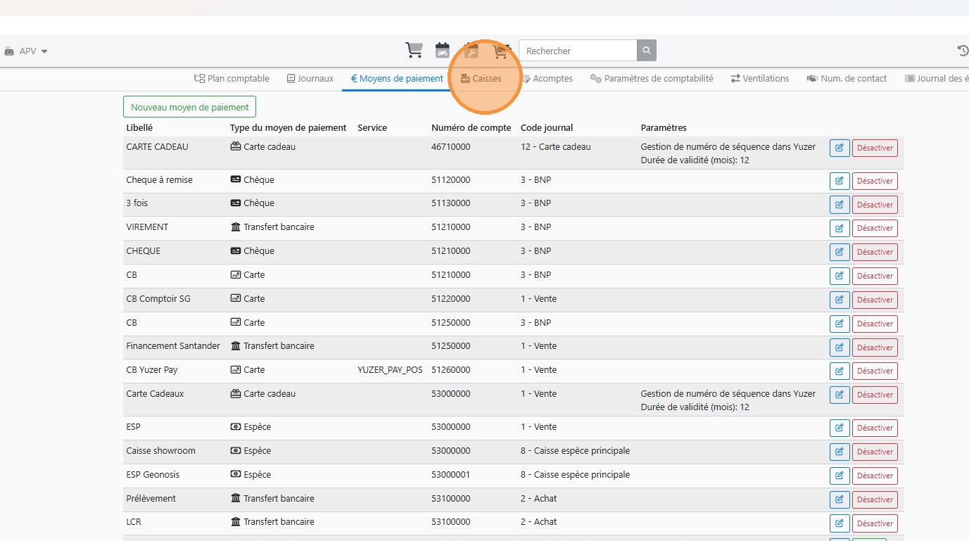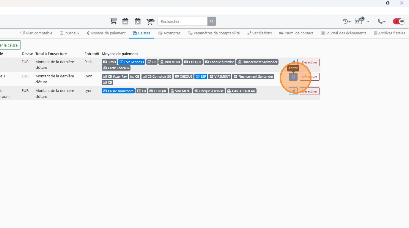 7\. Cliquer sur la caisse ou vous souhaitez rajouter ce moyen de paiment