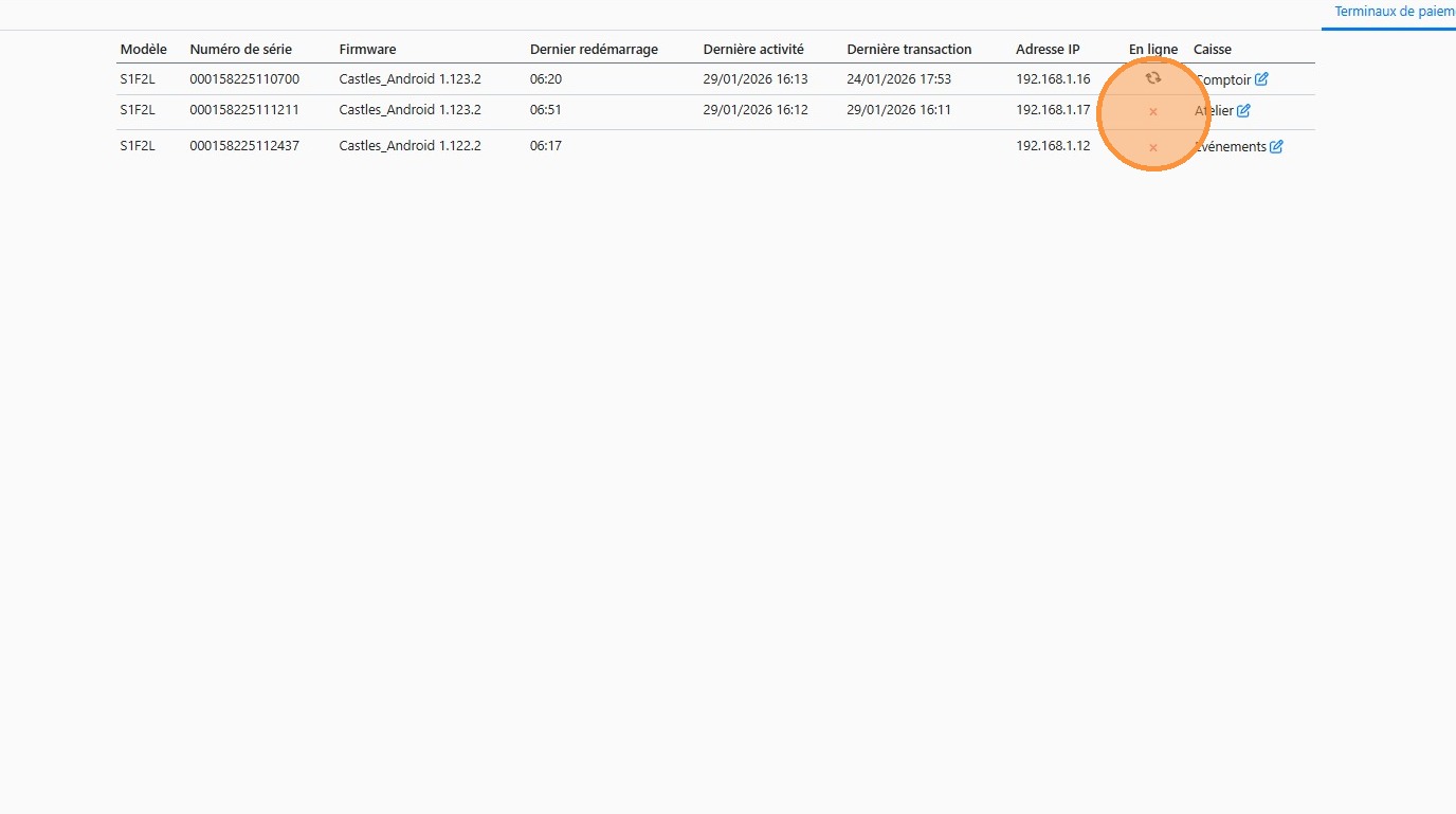 13\. La colonne [[En ligne]] vous renseigne sur l'état de la connexion entre votre ordinateur et le TPE :