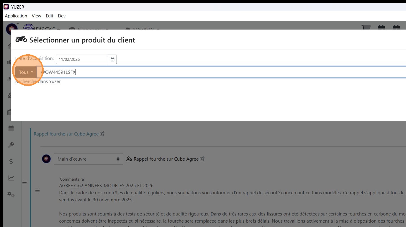 16\. Renseigner le n° de cadre et cliquer sur le menu déroulant [[Tous]]