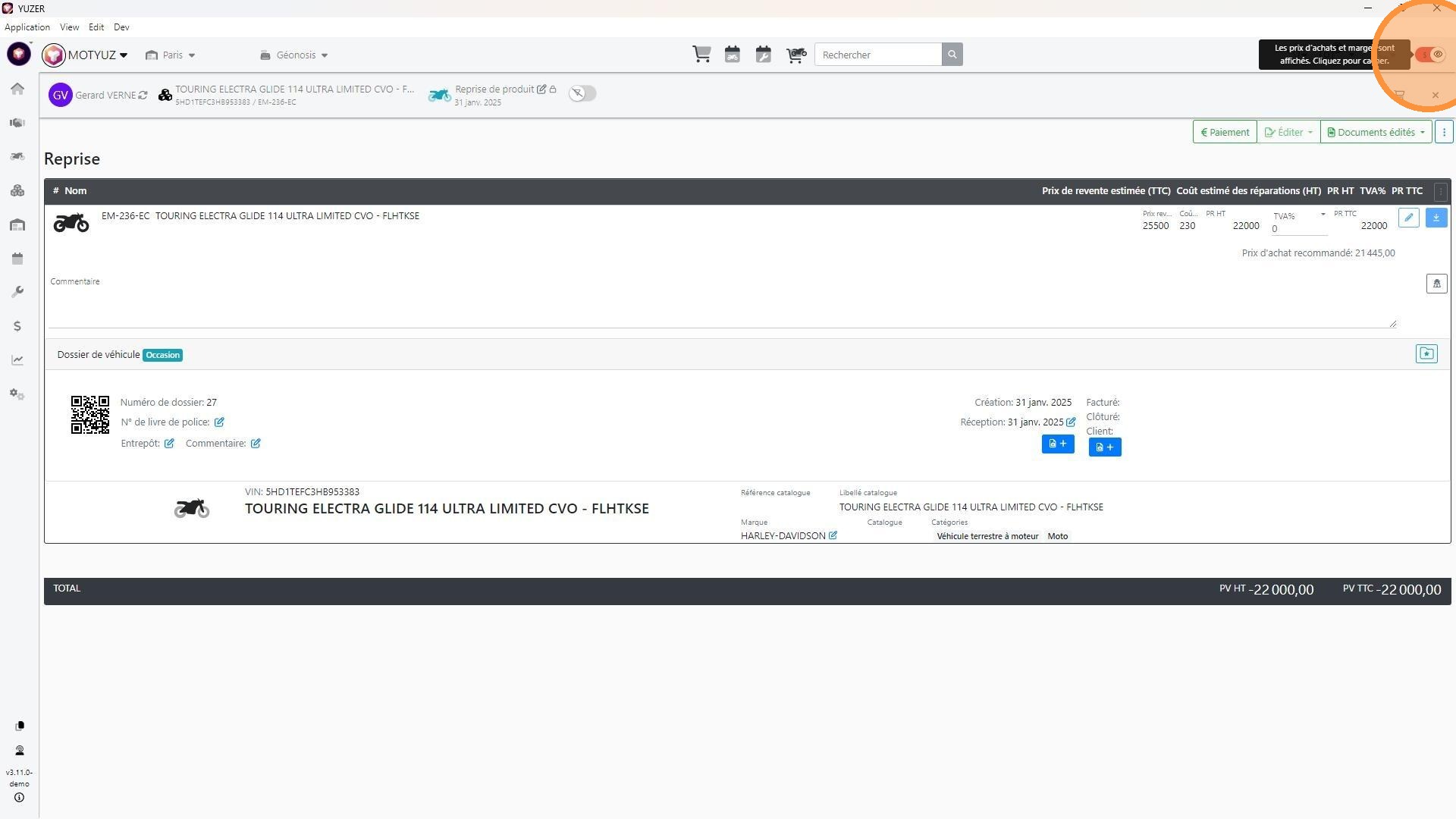 Alert: Vérifier que vous êtes bien mode vue avec les prix d'achat en haut à droite de l'écran en cas d'absence des champs de prix d'achat.