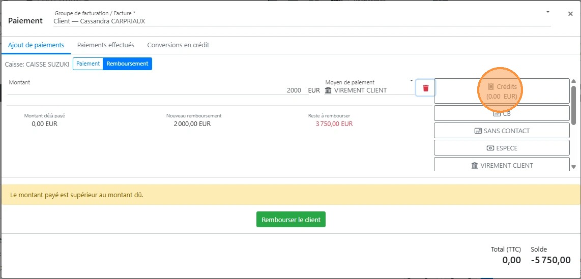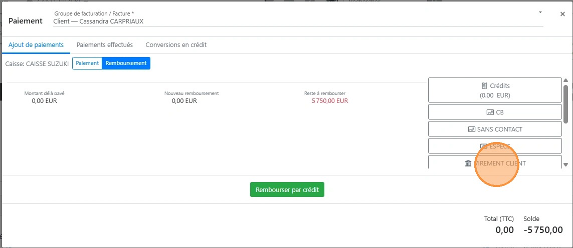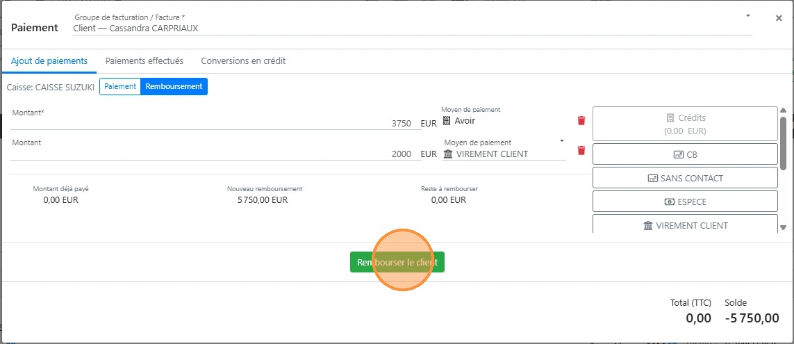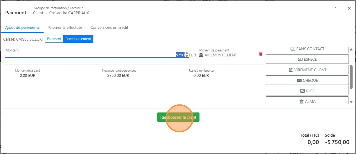 34\. Cliquer sur le bon [[mode de règlement]] qui va vous permettre de rembourser votre client