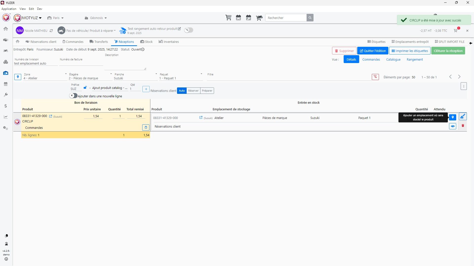 Attribution d'emplacement de stockage à une ligne dans une réception